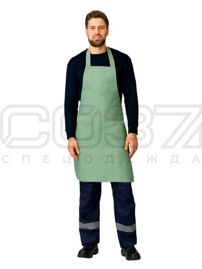 - Фартук оснащен цельнокроеной грудкой и шейной замкнутой бретелью.